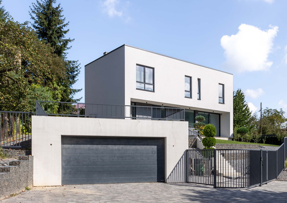 Вуличні сходи з підігрівом унеможливлюють намерзання льоду взимку, значно спрощуючи процес реалізації та забезпечуючи екологічний підхід з меншим втручанням у схил. Довгий балкон, як в гуцульській хаті, слугує і входом до будинку, і виходом з вітальні. Півтора метра нависаючого другого поверху забезпечують повне затінення вікон влітку, що рятує від перегріву та надмірного використання електроенергії для охолодження будинку. Площа самого будинку без гаража - 154 м². Незважаючи на це, нам вдалося розмістити простору кухню-вітальню, котельню та санвузол на першому поверсі, а також спальню батьків з гардеробом та ванною кімнатою і, звісно, дві дитячі зі своєю окремою ванною на другому поверсі.